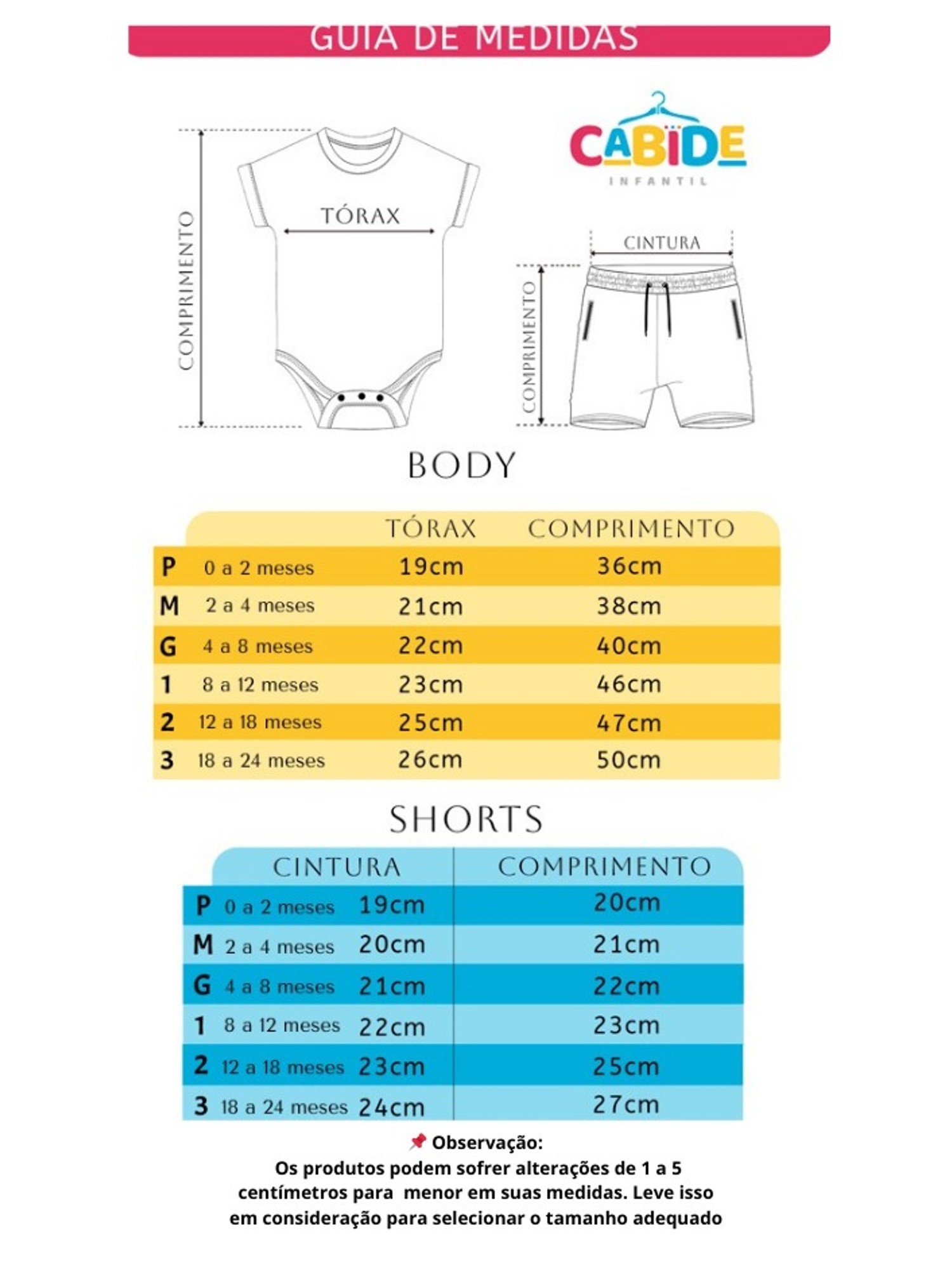 Os produtos podem encolher entre 2 e 5 cm nas medidas após a lavagem, conforme o modo de lavagem. Leve isso em consideração ao escolher o tamanho. Para garantir que as peças permaneçam com o tamanho adequado e confortável para o bebê, siga atentamente as recomendações de lavagem e cuidados, assegurando que seu pequeno esteja sempre bem-vestido e confortável.