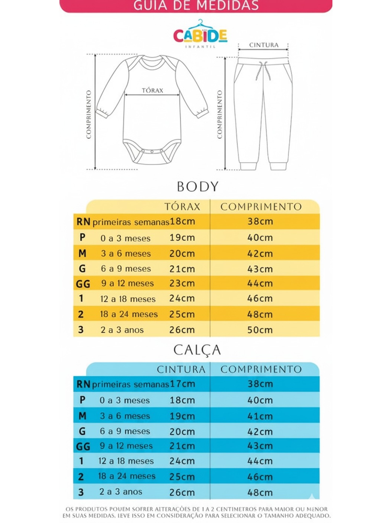 A tabela pode sofrer alterações de 1 a 2 cm para mais ou menos, leve isso em conta na hora de selecionar o tamanho adequado.