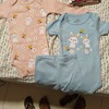 A primeira peça é rosa, a segunda peça junto com a calça são na cor azul claro.