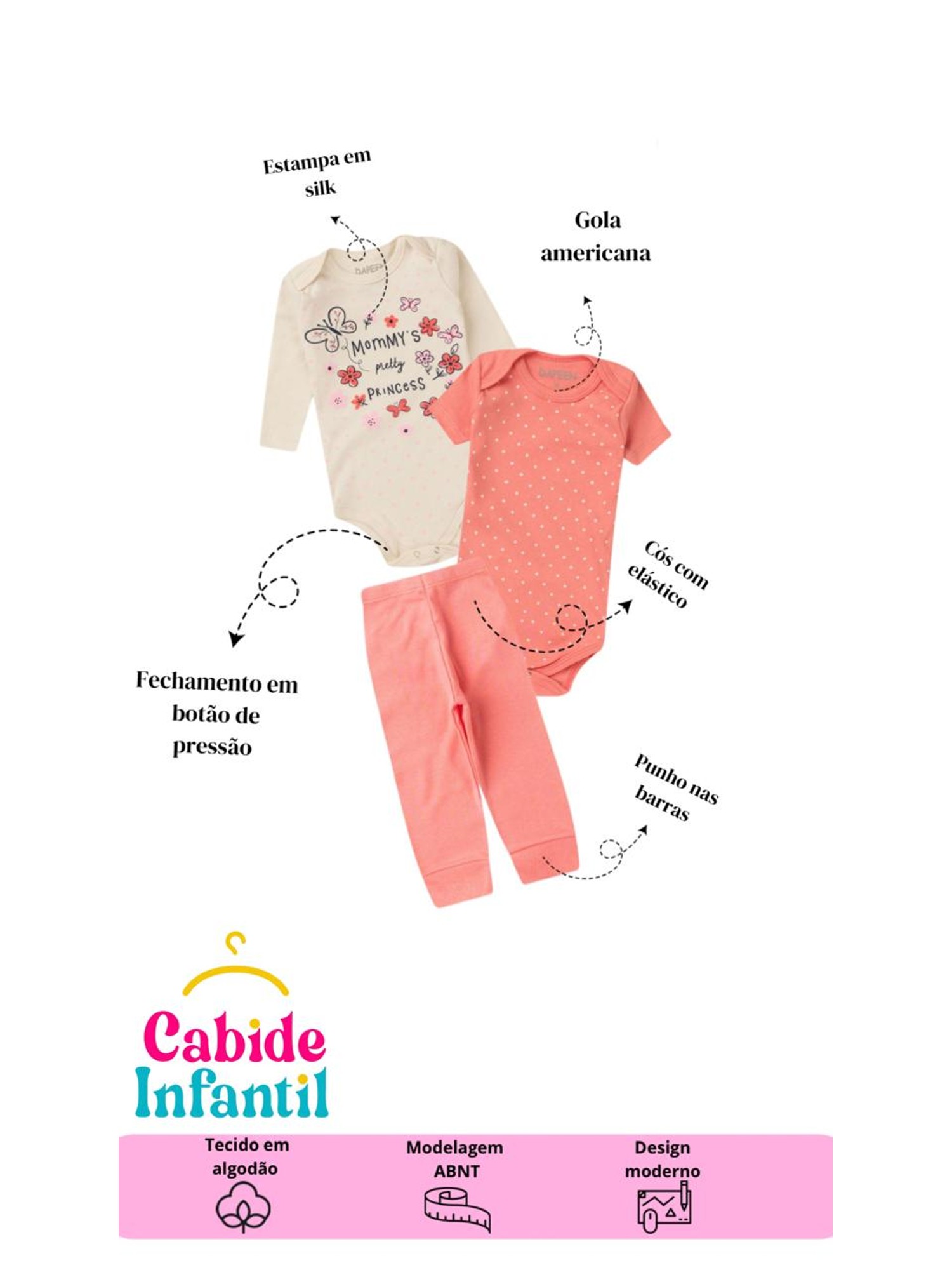 O Kit Body Bebê Menina Suedine é um kit de body's que conta com três peças estilosas, modernas e de altíssima qualidade. Pensando em lhes proporcionar versatibilidade, o kit foi desenvolvido para ser usado tanto casualmente quanto nas ocasiões mais especiais. São peças com estampas atuais, produzidas no Brasil, que contam com malha fresquinha, de alta durabilidade e que oferecem muito, mas muito conforto para o seu bebê. Para que se adapte perfeitamente ao corpo, os body's possuem uma modelagem com design moderno e são confeccionados em suedine com tecido 100% algodão. O decote é americano e todas as nossas estampas são feitas em silk. As peças também contam com um botão de pressão no entre pernas para melhor ajuste ao corpo do bebê. Já a calça possui punhos e elástico no cós. Para a Cabide Infantil, toda criança precisa vestir-se de peças de qualidade, confeccionadas com matérias-primas adequadas à sua proteção e bem-estar. Somos uma loja especializada em roupas infantis e que trabalha com produtos que proporcionam mais do que estilo, sempre preocupados em entregar bem-estar e segurança para os pequenos. Roupa infantil com qualidade e preço baixo você encontra aqui! Compre na Cabide Infantil.